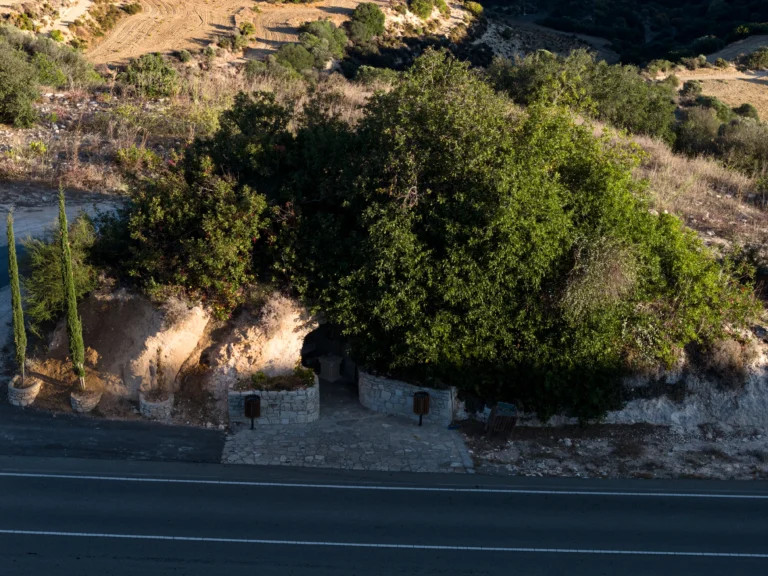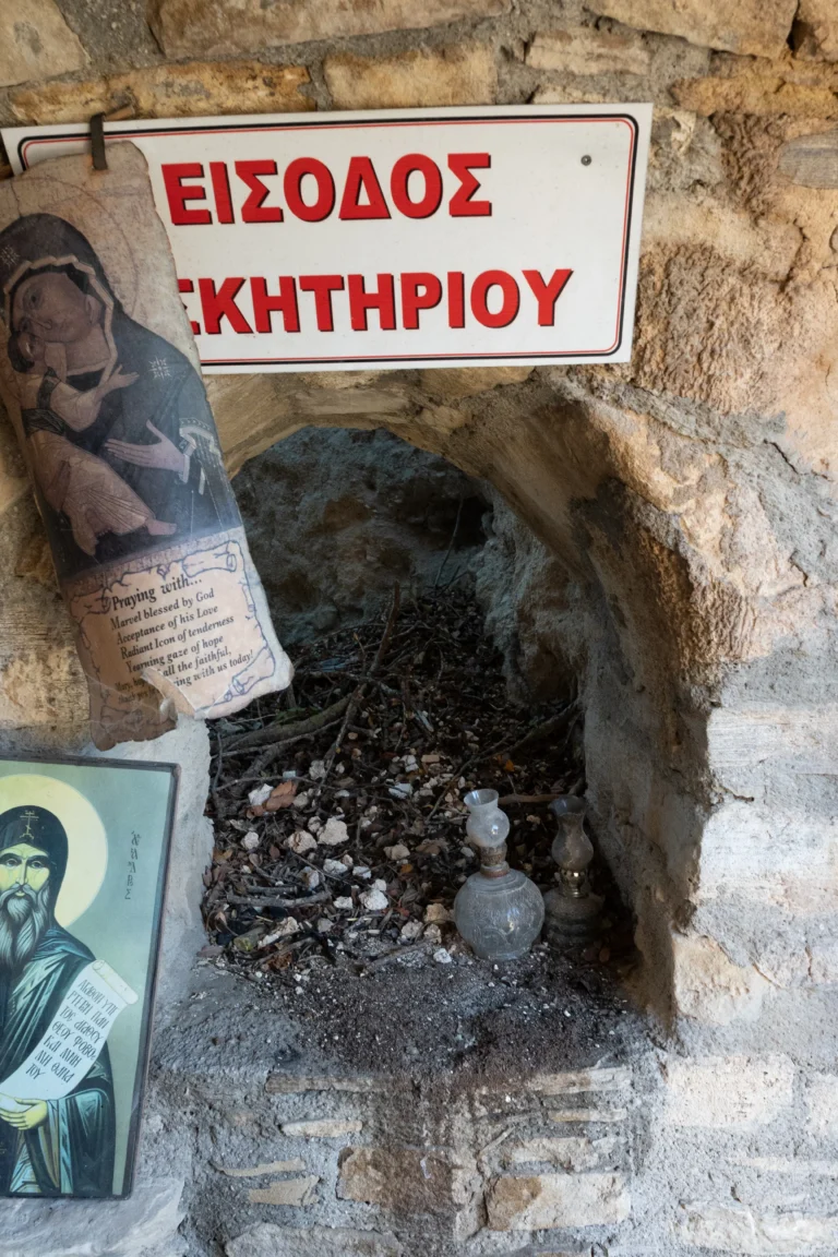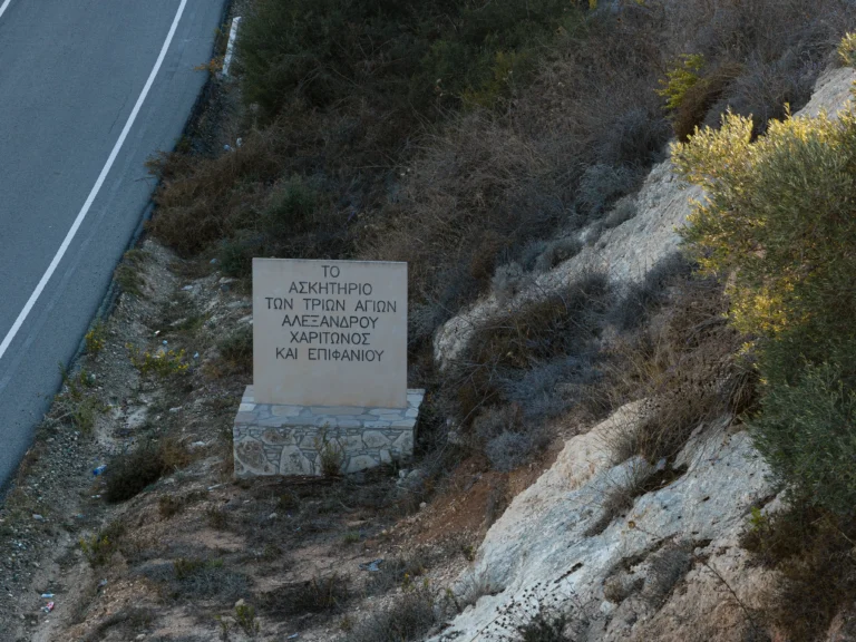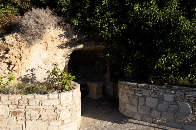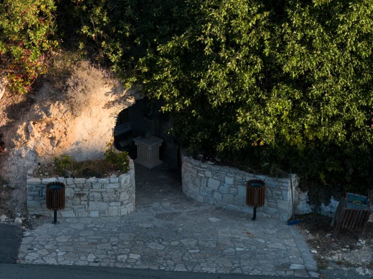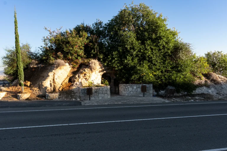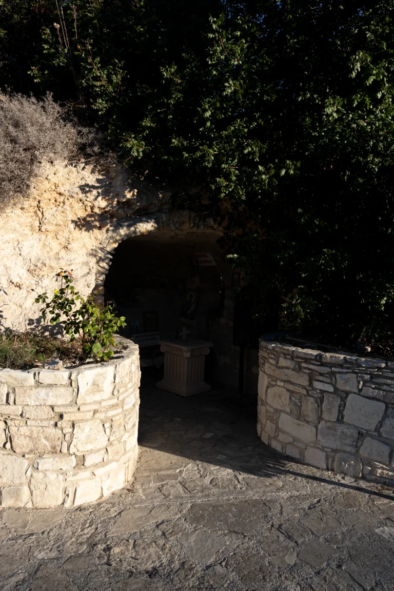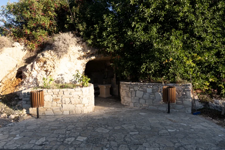 On a nearby hill just west of the village stands a small marble-carved cave shrine. Discovered during road construction, the cave resembles a carved tomb with a vaulted ceiling. According to local tradition, it honors three early Christian ascetics (Saints Epifanios, Chariton and Alexandros) who fled Roman Palestine and lived in seclusion here. The cave (bare and unpainted) is open to the sky and visited by villagers on the saints’ feast days.