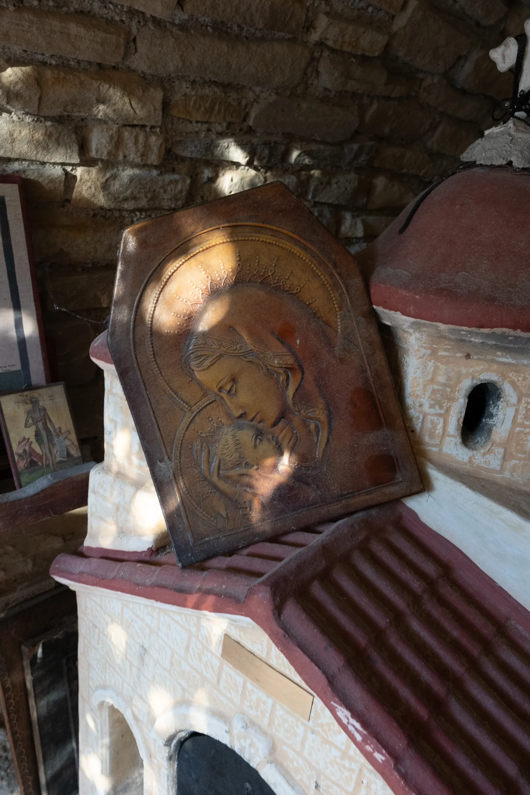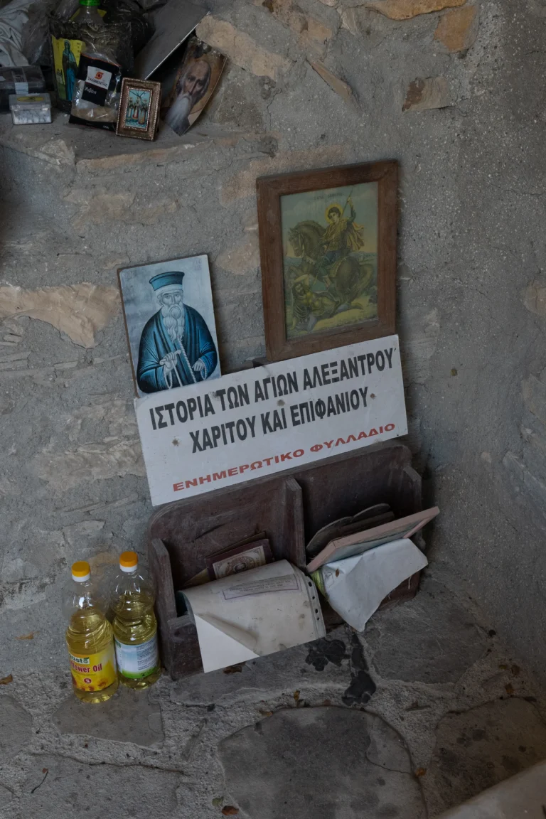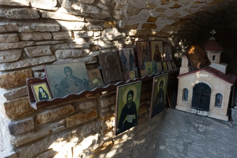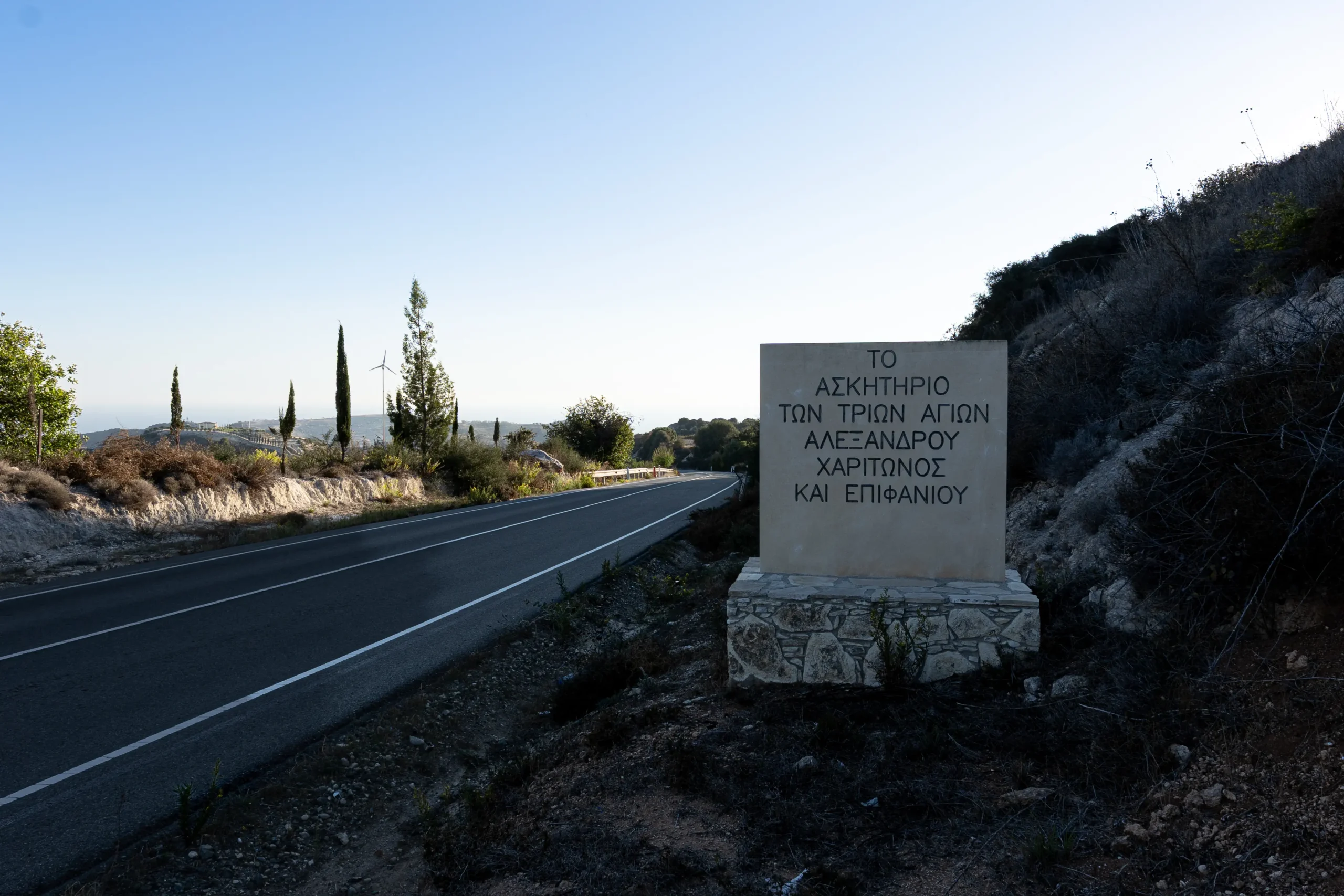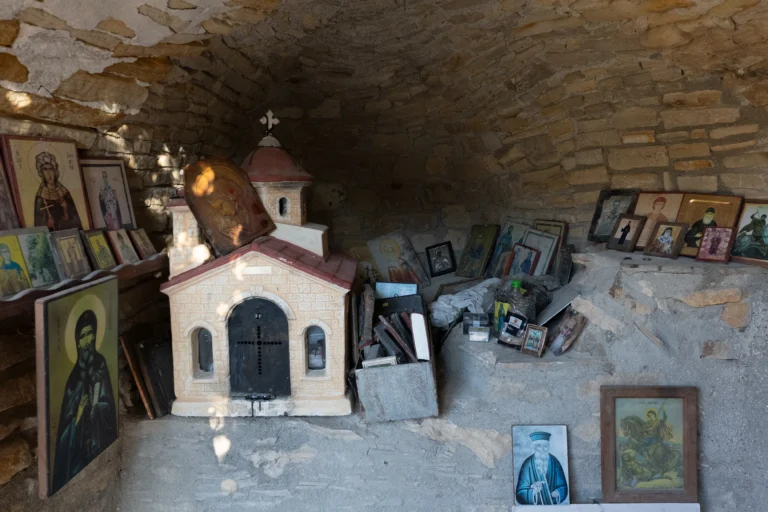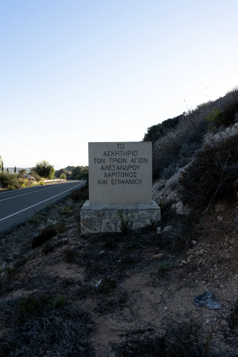 On a nearby hill just west of the village stands a small marble-carved cave shrine. Discovered during road construction, the cave resembles a carved tomb with a vaulted ceiling. According to local tradition, it honors three early Christian ascetics (Saints Epifanios, Chariton and Alexandros) who fled Roman Palestine and lived in seclusion here. The cave (bare and unpainted) is open to the sky and visited by villagers on the saints’ feast days.