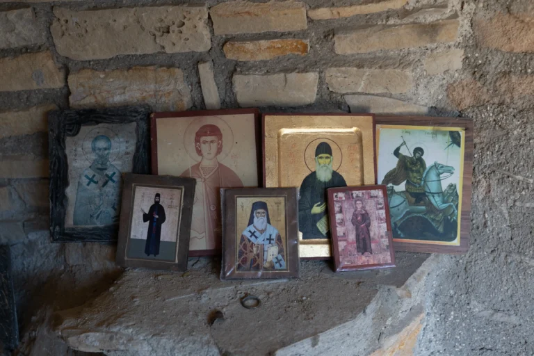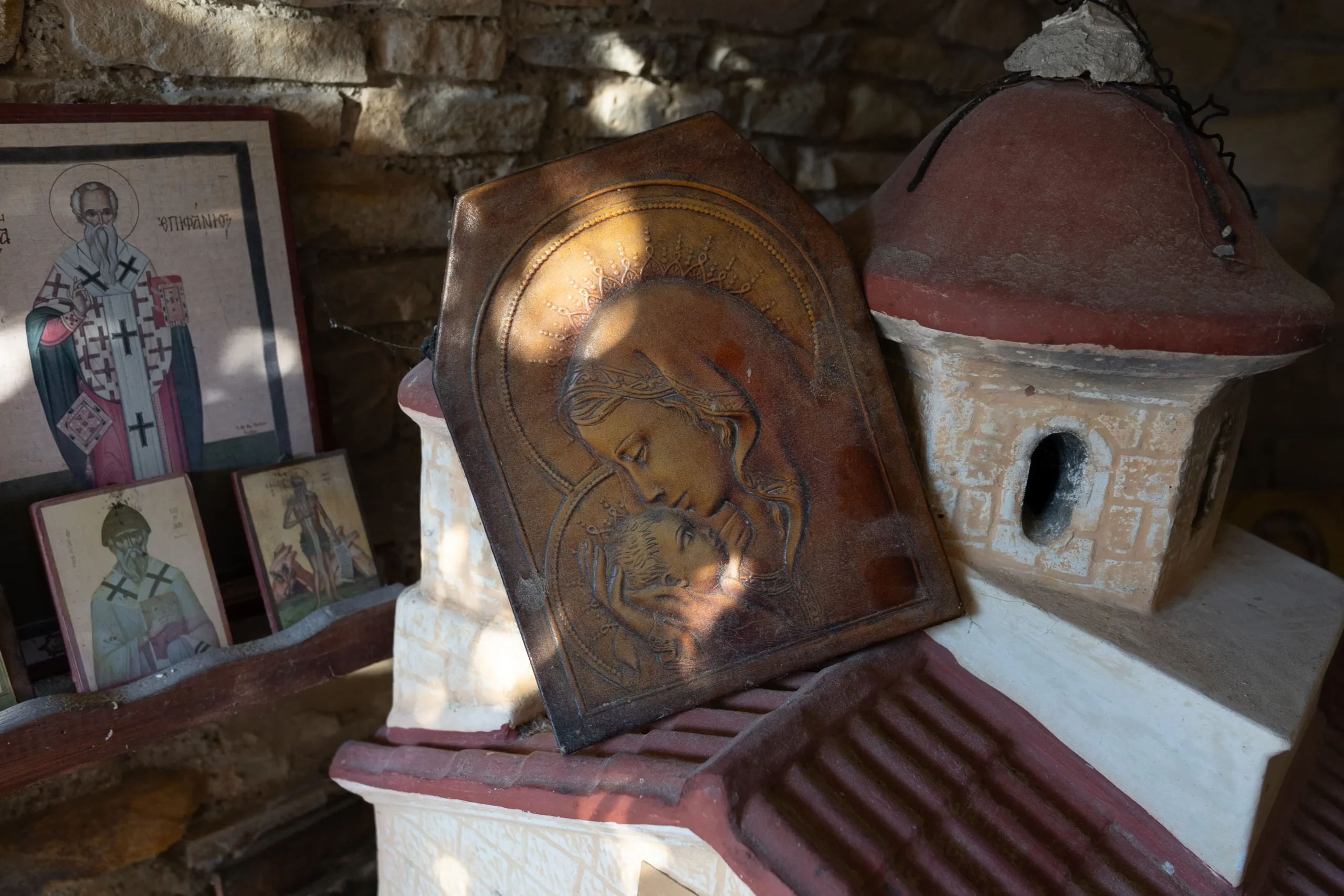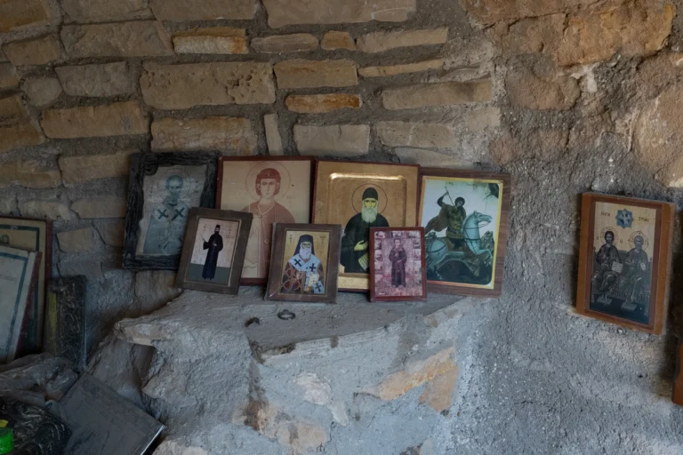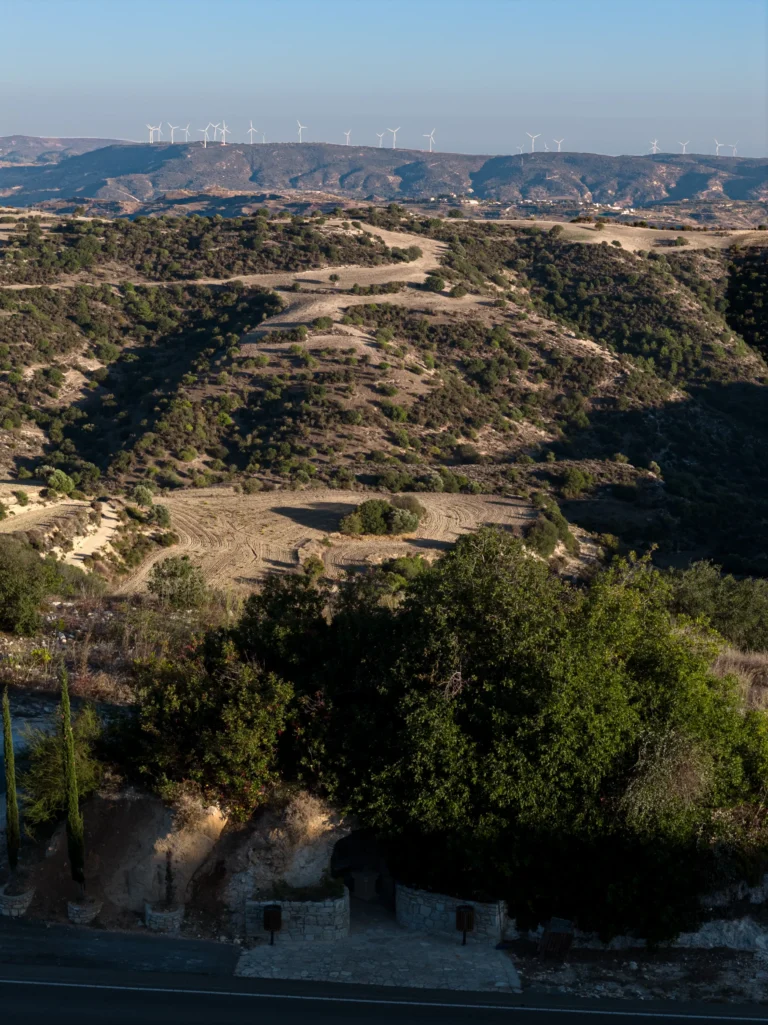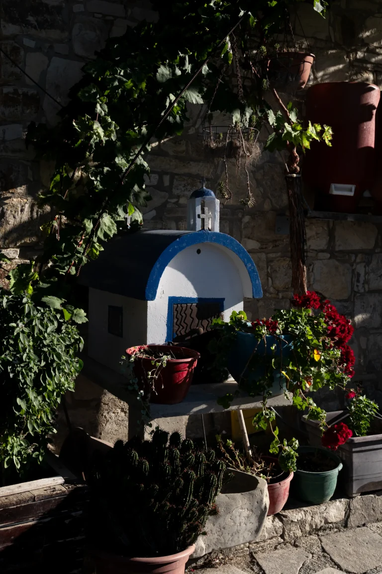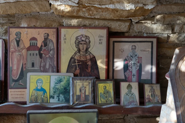 On a nearby hill just west of the village stands a small marble-carved cave shrine. Discovered during road construction, the cave resembles a carved tomb with a vaulted ceiling. According to local tradition, it honors three early Christian ascetics (Saints Epifanios, Chariton and Alexandros) who fled Roman Palestine and lived in seclusion here. The cave (bare and unpainted) is open to the sky and visited by villagers on the saints’ feast days.